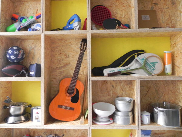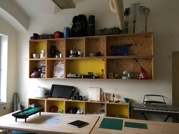 V pražské Knihovně věcí mají třeba houpací síť, digitální i analogový fotoaparát, běžky, kytaru, klávesy a celou řadu různého nářadí. Kromě sdílení předmětů nabízí také sdílení zkušeností, základy praxe v rukodělných, řemeslných a kreativních činnostech. „Nechceme mít jen skladiště věcí. Chceme vytvořit místo, kde se lidi potkávají, založit depozit předmětů, které se dají prakticky použít. A tak máme v plánu workshopy, kde se lidi můžou naučit něco, co si ještě nezkusili. Taky tím chceme trochu upozornit na to, že řemesla pomalu zanikají,“ říká Tom. V létě byl nejoblíbenější kurs vyrábění barefootových sandálů; nejvíc se půjčovaly stany.
