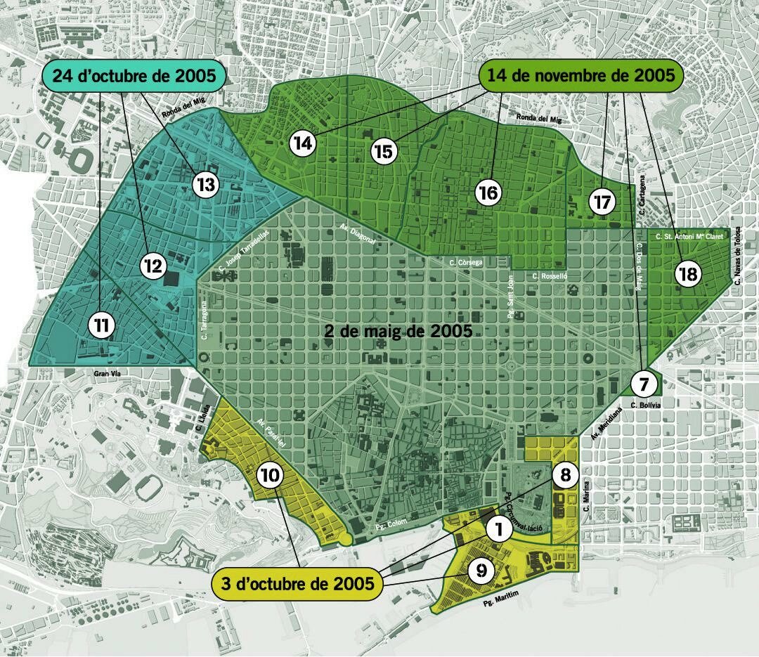 **Etapa 1 – 1983** Prvních 281 placených parkovacích míst **Etapa 2 – 1992** Olympijské hry **Etapa 3 –1998** Pakt mobility * 2000–2004 Návrh na zvrácení trendu nárůstu objemu individuální dopravy regulací parkování v centru **Etapa 4 – 2001** Zavedení parkovacích míst s možností parkovat jen krátkou dobu a regulace míst pro nakládku a vykládku ve starém městě (Ciutat Veilla e Eixample) **Etapa 5 – 2005** Regulace parkování v nové zóně Area Verde nad 7 000 atraktivními parkovacími místy **Etapa 6 – 2006–2012** Plán městské mobility 2006–2012 **Etapa 7 – 2007** Zavedení podpory cyklistiky **Etapa 8 – 2013** Více než 54 000 placených stání, 11 000 míst pro nakládku a vykládku, 55 000 míst pro motocykly *Pakt mobility: inovativní proces ustavením fóra participující veřejnosti zahrnující veřejné instituce, odborníky, asociace a zástupce dotčených organizací. Cílem bylo sestavit strategie a jednotlivé kroky se zaměřením na kvalitu veřejných služeb, bezpečnost dopravy a podporu cyklistiky se záměrem snížit objem dopravy v centrální oblasti města, zlepšit kvalitu veřejného prostoru a revitalizovat centrum. Tento pokračující proces vyústil v kampaně ve školách a kancelářích, kampaně na cestování veřejnou dopravou, reorganizaci plánu parkování určením tzv. zelené oblasti (Area Verde) a strategickém plánu pro cyklistiku (2006). Záměrem systému Area Verde bylo snížit počet cest do centra města osobními vozidly. Systém nebyl postaven na zpoplatnění dle objemu dopravy, tak jako v Londýně (tzv. congestion charging), ale na aplikaci tarifů na všechna parkování v centru města. 70 % osobních vozidel v Barceloně jede skrz centrální část města, tj. 1,15 milionu vozidel. 93 % z nich končí svou jízdu parkováním v centrální oblasti. Město se rozhodlo regulovat tento negativní jev změnou dopravního chování, a to organizací dopravy v klidu, řešením nelegálního stání a zvýšením šance zaparkovat pro rezidenty. Barcelona nasadila systém pro regulaci parkování skrze rezidentní parkování, časové limity a cenu. Vytvořila smíšené zóny a rezidentní zóny (historické jádro města; pouze pro rezidenty). Definovala pravidla pro městskou logistiku, motocyklisty, zvýšení obrátkovosti (systém chytrého parkování), vyhradila místa pouze pro rezidenty a podpořila sdílené jízdy (car pooling). Poplatek za rezidentní stání (nevyhrazené) za 1 den je v poměru 1 : 10 k ceně parkovného za hodinu. Instalovala 2800 parkovacích automatů s možností platby podle typu zákazníka, mincemi a bankovní kartou, s GPRS připojením a solárním napájením. Vybavila pěší strážníky i ty na motocyklech PDA pro možnost automatického záznamu o přestupku do centrální databáze. Sjednotila podobu nálepek do vozidel pro rezidenční stání. Došlo k okamžitému snížení počtu vozidel v centru o 12 % (dlouhodobě o 18 %). Zvýšil se počet přepravených osob v MHD o 6 %. Nelegální stání se snížilo o 49 %. ##Změny v uspořádání a kapacitě silnic a chodníků od 2003–2013## * Silnice: zmenšení plochy místních komunikací z 56 na 50 % * Chodníky: zvětšení plochy chodníků z 43 na 50 % * 18 % pouličního parkování, tj. 141 747 parkovacích stání (54 tis. placených parkovacích stání) * 82 % parkování mimo veřejný prostor, tj. 646 107 parkovacích stání (120 tis. placených parkovacích stání) Celkem je v Barceloně v režimu placeného nebo řízeného parkování 42 % všech parkovacích míst.