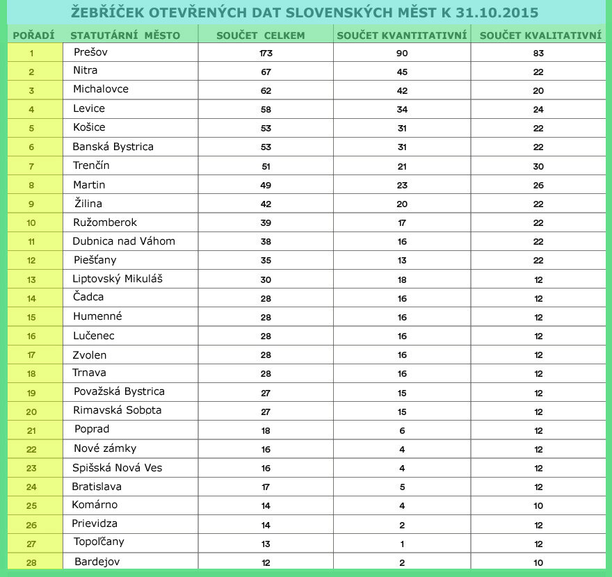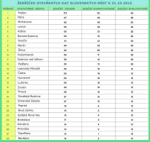 Téma inteligentních měst, tzv. smart cities, se čím dál častěji objevuje jak na tuzemských konferencích, tak na celoevropské úrovni. Jednou z oblastí, ve které by se netradiční přístup samosprávy k občanům, skrytý právě pod těmito slovy, měl rovněž projevit, jsou data, respektive jejich otevřenost. Již dnes je na Slovensku možné o informace a data vytvářená státní správou či samosprávou žádat na základě zákona č. 211/2000 Z. z., koncept inteligentního města však usiluje o výraznější posun – takové město umožňuje svým občanům, a nejen jim, svobodně a bezplatně přistupovat k datům, která v něm vznikají, využívat je a budovat nad nimi vizualizace, analýzy nebo mapy. Samosprávy nenakládají pouze s tabulkovými daty, jako jsou rozpočty nebo smlouvy, ale také s daty o prostoru; ať už jde o katastr nemovitostí, veřejnou zeleň nebo evidenci psů. Oba typy dat je možné uživatelům poskytnout v mnoha různých formátech. Některé z nich jsou otevřené, strojově čitelné, jiné mohou být proprietární, uzavřené. Vedení měst s ambicí vytvořit chytré město by mělo usilovat o skutečné otevření dat, tj. jejich poskytnutí ve strojově čitelných formátech. Kvalitní data by měla být rovněž doplněna metadaty, tedy informacemi o jejich vzniku, autorovi, aktuálnosti, licenčních podmínkách. Mnohé datové sady bez metadat prakticky ztrácejí svou hodnotu, neboť z nich lze jen obtížně odvodit, jaké informace vlastně obsahují. Naší snahou je tedy zhodnotit nejen fyzickou dostupnost dat, ale také kvalitu jejich poskytování, jejich popis či možnosti dalšího využití. K tomuto hodnocení jsme využili metodiku Konceptu inteligentních měst Ministerstva pro místní rozvoj (viz SC 01/2015), založenou na bodovém hodnocení sledovaných kvantitativních a kvalitativních charakteristik, které dokážou městská data popsat.